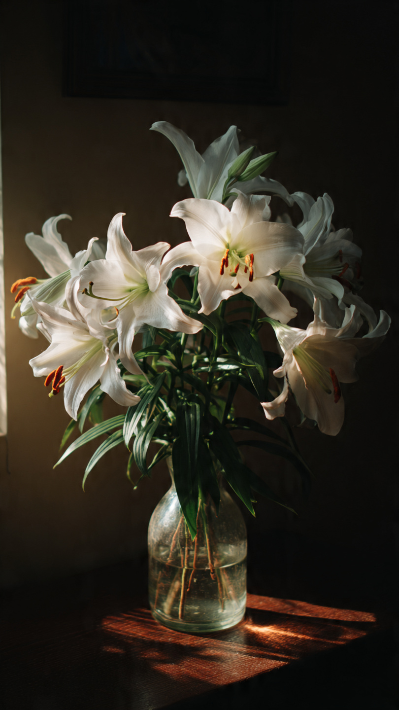 Elegant petals, sweet fragrance, maybe a vase on the table.