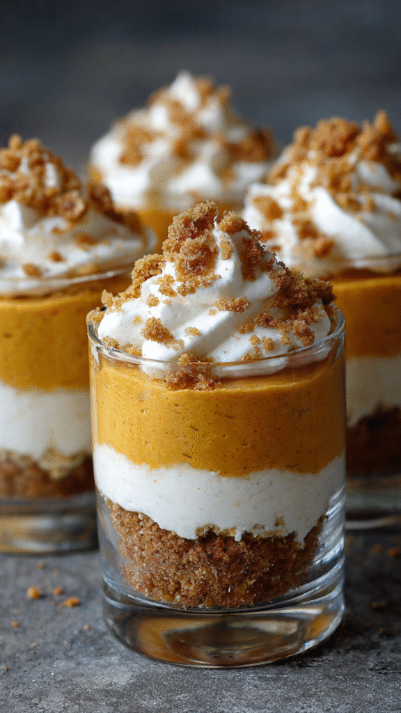 Perfect for quick preparation, these individual cheesecake cups layer pumpkin mousse, spiced cream cheese, and crushed graham crackers. They’re simple, festive, and great for guests who prefer lighter portions.